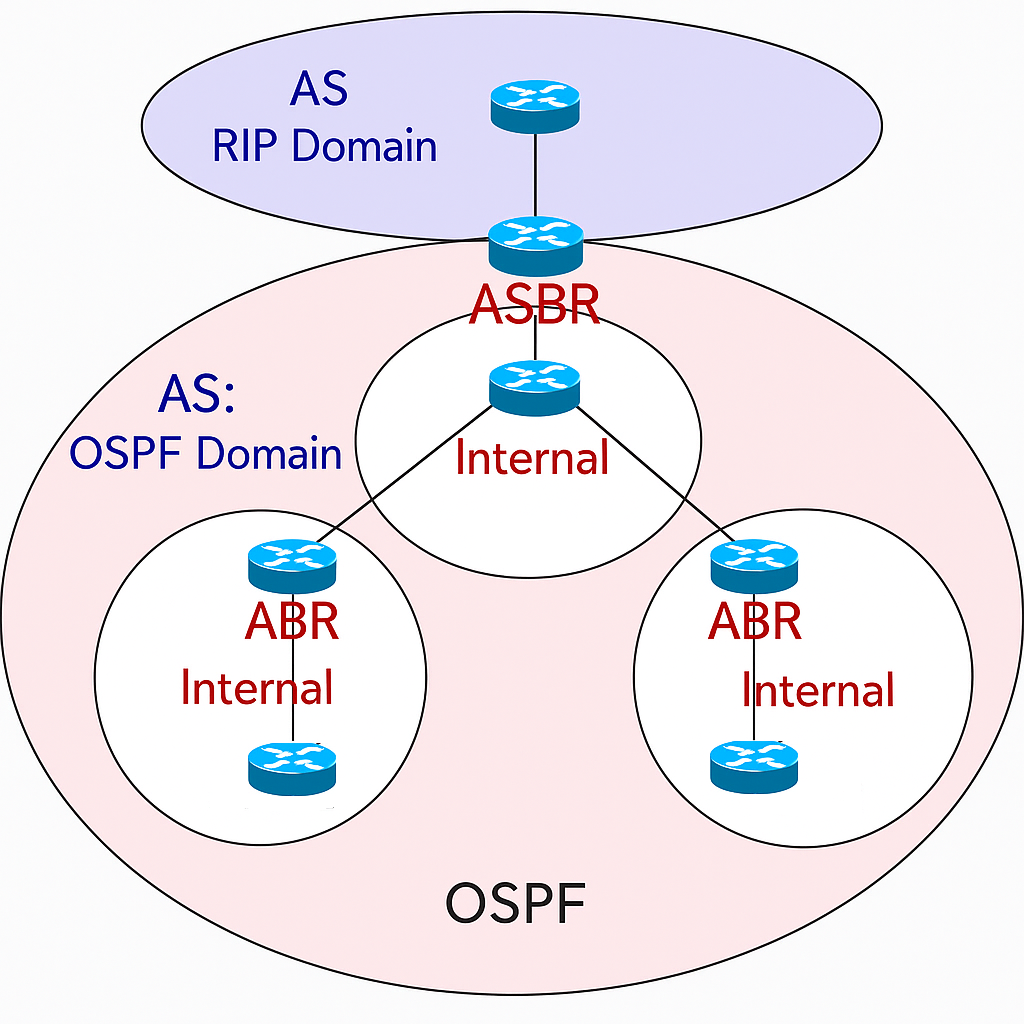 | ASBR(Autonomous System Boundary Router) | 外部ルーティングプロトコル(例:BGP, RIP)と接続するルータ。 |