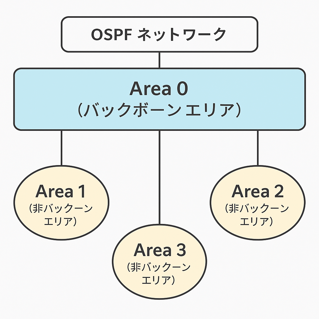 | バックボーンエリア(Area 0) | ネットワークの中心エリア。全エリア間の経路情報を中継する。 | すべてのエリアはArea 0に接続しなければならない。 |