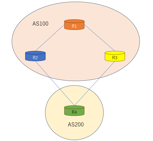 - 同じ AS からきた経路同士だけで比較される(上図だと、R2とR3からきた経路)